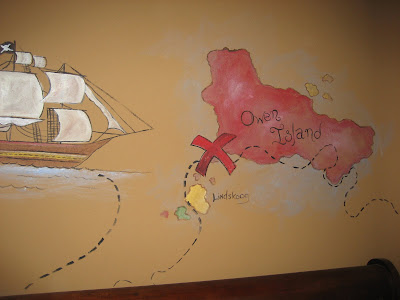 I recently showed Owen's room back when he got his big boy bed, but he followed me around saying "My room, ONENS room" =)...so here are a few pics. His murals are a treasure map. Each island and water is named after a last name in our family.