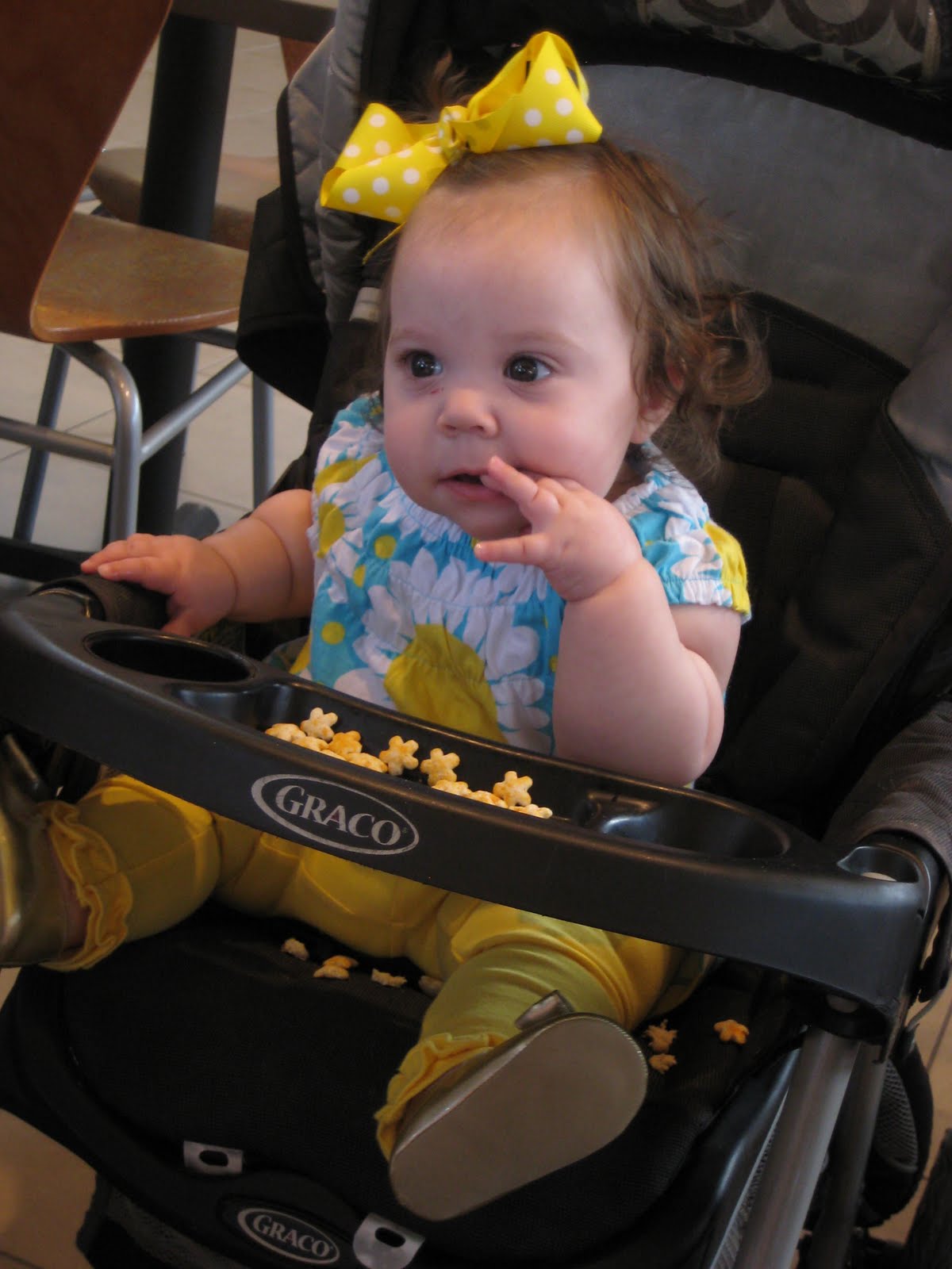Sweet Bree is already 7 months old!!! Current obsessions - FOOD!!! She can eat her weight in Macaroni and Cheese, crackers, yogurt, pudding...you get the picture!! Her paci, right now plastic eggs and other toys, rolling all over the place, waving bye, saying "HHHHIIIIIIII", baths, her brother and sister, the dogs, Mama, pulling off jewelry on everyone, phones, remote controls, and stroller rides! Tonight she just started scooting, almost army crawling!!!!